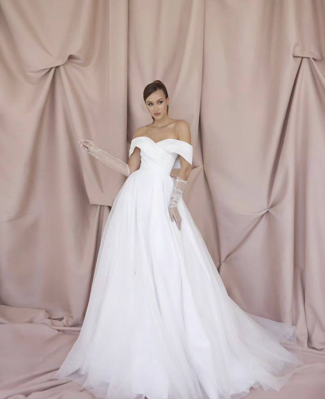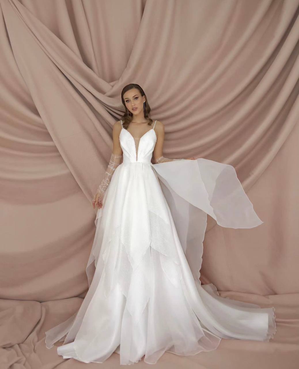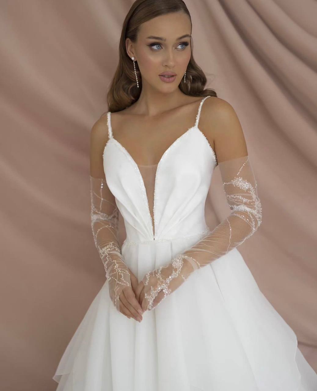 Шикарное платье А-силуэта выполнено из фатина с переливающимся рисунком. Небольшой шлейф. Съемные прямые рукава. Платье на корсете.