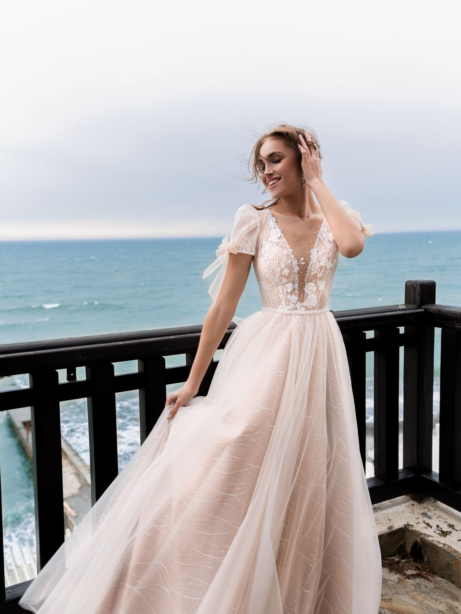 Воздушное платье силуэта "принцесса". Верх платья декорирован кружевом и драпировкой из фатина гофре. Рукава платья съемные, так же выполнены из фатина гофре. В наличии платье с юбкой без рюш.